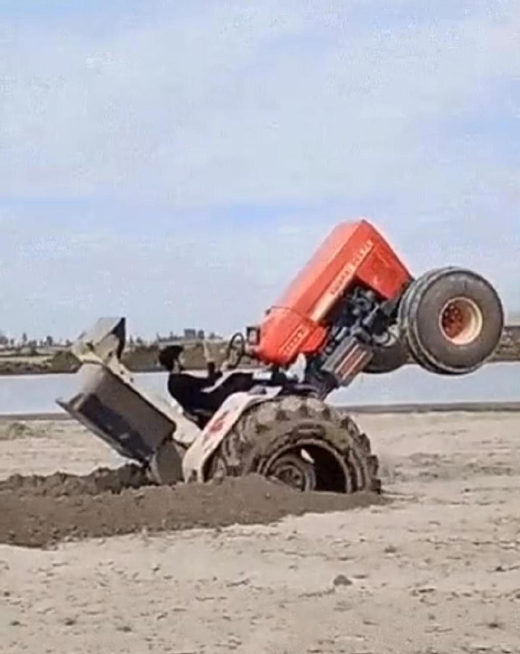 可能是之前的驾驶员玩了一会,地上出现了一个大坑,拖拉机的驱动后轮在坑里打滑。