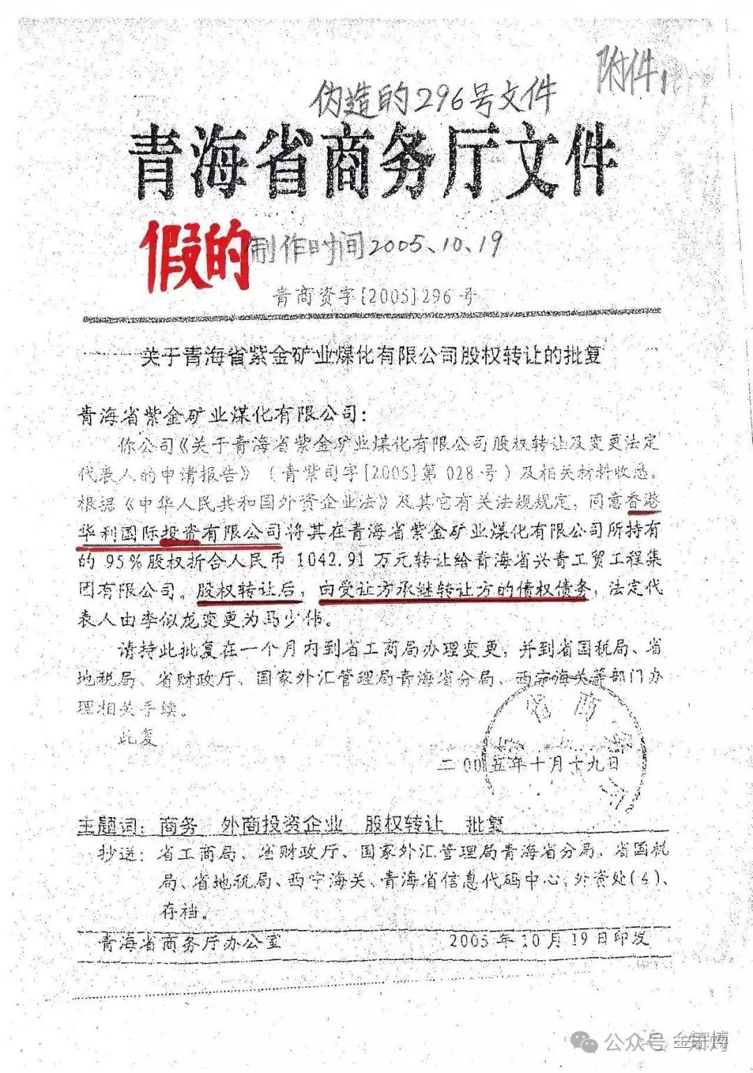 2014年4月10日,在金土地公司訴香港(专题)華利國際有限公、興青公司侵權糾紛壹案中,興青公司出具了關鍵證據——青海省商務廳青商資字[2005]296號《關於青海省紫金礦業煤化有限公司股權轉讓的批復》(簡稱296號文件,假的),法院依據這壹關鍵證據,判決金土地公司敗訴。