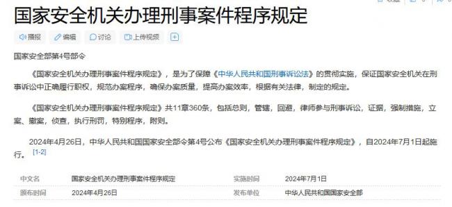 中国国安部发布的《国家安全机关办理刑事案件程序规定》截图(百度百科)