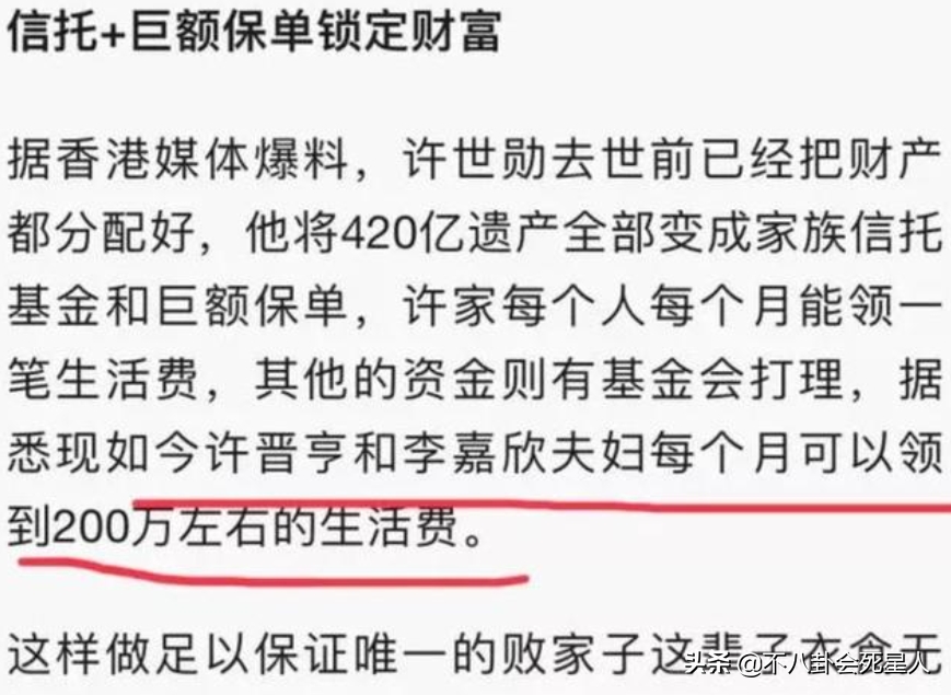 maohu 于 2022-4-12 00:00 写道: 原创:不八卦会死星人 港圈中不乏许多身家不菲的富二代们,但其实他们也早已结婚生子,纷纷有了富三代们。而有一些港圈富三代,堪称是“投胎界的王者”,小小年纪就已有丰厚的资产可以继承,完全就是含着金汤匙出生长大。 1. 李嘉欣儿子 被誉为“香港最美港姐”的李嘉欣,在2006年被发现她与中建集团大股东许世勋之子许晋亨约会,2008年李嘉欣与许晋亨举办婚礼,成为了港圈中的豪门阔太。3年后,李嘉欣生下一个男孩,取名许建彤,这个孩子一出生就是富三代,一直都备受关注。 很多人都知道许晋亨的爷爷是已故第一代船王许爱周,他的父亲是中建企业集团主席许世勋,而他自己则是中建企业董事。据悉许氏家族资产在2006年时就估值200亿港元,家族近些年的主要业务包括地产发展及投资。 而爷爷许世勋对家族资产采用基金管理形式,早就把400多亿身家存入了家族信托中,许晋亨夫妇现每月在家族信托基金支取200万港币做生活费。 而作为许晋亨独子的许建彤被传将继承爷爷的百亿遗产,在成年之后可以一次性领取这笔高达400亿的资产。据悉爷爷许世勋对这个孙子寄予厚望,将其视为许家未来发展的掌舵者,所以对他十分疼爱。 除此之外,许晋亨夫妇持有80多套豪宅房产,一个月光靠收租就可超4000万,一年下来租金也是将近5亿,夫妻俩的财富也是将由独生子许建彤继承,而且许家还将价值1.6亿的豪宅送给了许晋亨夫妇,也是为了让孙子住得更舒适。 而才11岁的许建彤,还展现出了商业头脑,开了自己的个人服饰品牌,还在社交平台上做网红和大家分享交流,真是令人羡慕的富三代人生啊。不过他的颜值没有遗传到妈妈李嘉欣的美貌,更加像爸爸许晋亨。 2. 梁洛施儿子 中英葡混血女星梁洛施,在2007年经过杨紫琼介绍认识了香港首富李嘉诚的次子李泽楷,李泽楷有着“小超人”的美称,其身家财富都不菲。 2022福布斯香港富豪排行榜发布,李泽楷以47亿美元上榜,位列第18位。据悉在李嘉诚宣布退休时把财产分给了两个儿子,他曾说小儿子李泽楷基金会里有900亿美金,真是妥妥的顶级富二代。 而2009年梁洛施为其诞下一名男婴,第二年又再次生下一对双胞胎,成功变身为首富长孙之母。 在连生三子后,很多人都认为梁洛施会嫁入豪门,但两人却宣布分手,据传梁洛施拿了5亿分手费,还被嘲是“史上最贵子宫”。 不过即使没有嫁入豪门,梁洛施的孩子们也将拥有财产继承权,而且爷爷李嘉诚和父亲李泽楷对其长子都十分重视和喜爱,据港媒报道长子李长治从小就喜欢武术,小小年纪就参加了比赛拿了奖,他的名字寓意着“长治久安”,李泽楷十分疼爱儿子们,三个儿子的生活都十分奢华。 3. 奚梦瑶儿子 曾是维秘超模的奚梦瑶,一朝嫁入豪门,嫁给了赌王何鸿燊之子何猷君。 2019年何猷君宣布妻子奚梦瑶生子的喜讯,儿子取名叫何广燊,也是赌王的长孙。据悉赌王对这个孙子十分期待,四太梁安琪更是送五亿豪宅给了夫妻俩,据传还给了奚梦瑶2亿作为奖励。 后来奚梦瑶又二胎生女,凑齐一个好字,而作为赌王家族的第三代,奚梦瑶的孩子们生活自然是非常奢侈的。 之前她在社交平台上晒出视频,分享孩子们的用品,就有网友说这些东西都价值不菲,蜡笔、围脖、鞋子价格都很贵。 要知道奚梦瑶作为四房媳妇儿,她的孩子以后不仅能继承父母的资产,还能继承四太的身家,前不久公布的福布斯香港50大富豪排行榜中,梁安琪以29亿美元(折合人民币184亿)的身家排行在了33位,不仅如此据港媒报道四太名下有很多物业,总价值超4百亿,是名副其实的百亿富婆。 之前四太也说了,希望奚梦瑶至少能生3个孩子,看来奚梦瑶还需继续加油了。 不过她和两个宝宝现在的资产已经不少了,都过着富足奢侈的生活,就是什么都不做,也能轻松得到赌王家族的财产继承。 [align=justify] |