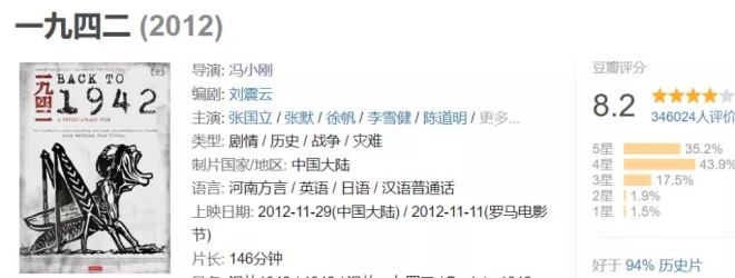 再來看反面例子,馮小剛在2012年拍的《壹九肆贰》,當年上映時馮小剛曾放言要收獲8億票房,結果票房只有3.7億,讓片方足足虧了9千萬,也讓華誼和馮小剛從此壹蹶不振。
