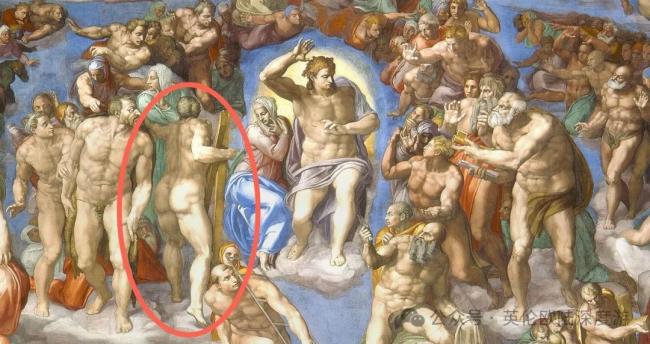 圣母下方拿着烤架的是圣劳伦斯,他因为坚持信仰被活活烤死;以及拎着自己被剥下的整副人皮的圣巴多罗买。大家注意圣巴多罗买拿着的人皮上有一副面孔,那是米开朗基罗的自画像。