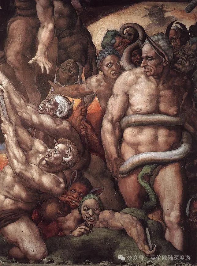 没错,克里特国王米诺斯死后就来冥界做了判官。这些都是但丁对于地狱的描写,米开朗基罗做了借鉴。