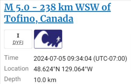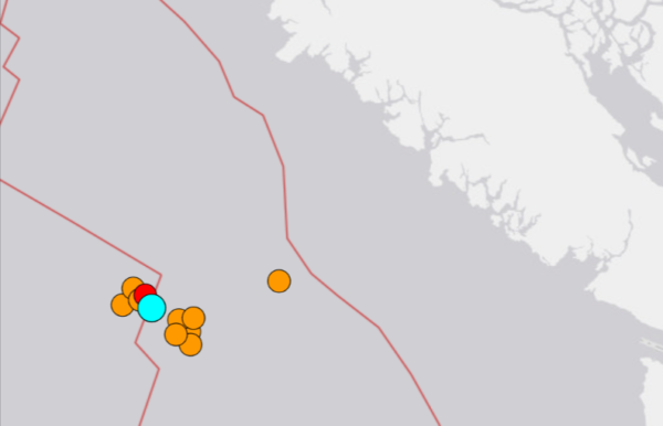 美国地质调查局表示,地震发生在托菲诺(Tofino)西南偏西 232 公里处,深度10公里。