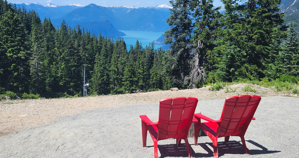 午餐後繼續乘坐老鷹快車肆人吊椅(Eagle Express Quad Chair) 直接登上黑山(Black Mountain),到達海拔 1,200 米(3,940 英尺)的黑山山頂。 在這裡可以以不同的角度欣賞豪灣(Howe Sound)、喬治亞海峽的絕美風景。這裡還放了不少可愛的紅椅子,讓大家小憩時眺望美景: