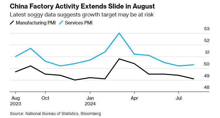 中国国家统计局(National Bureau of Statistics)表示,8月官方制造业PMI从7月份的49.4降至49.1.进一步加剧悲观情绪。自2023年4月以来,除了三个月外,该指数一直低于50的荣枯分界线。8月份投入成本和产出价格分项指数均有所下降。