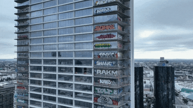 如今,这个“新天际线”已经成为涂鸦爱好者的乐园,大楼的阳台外侧被涂成各种标识。