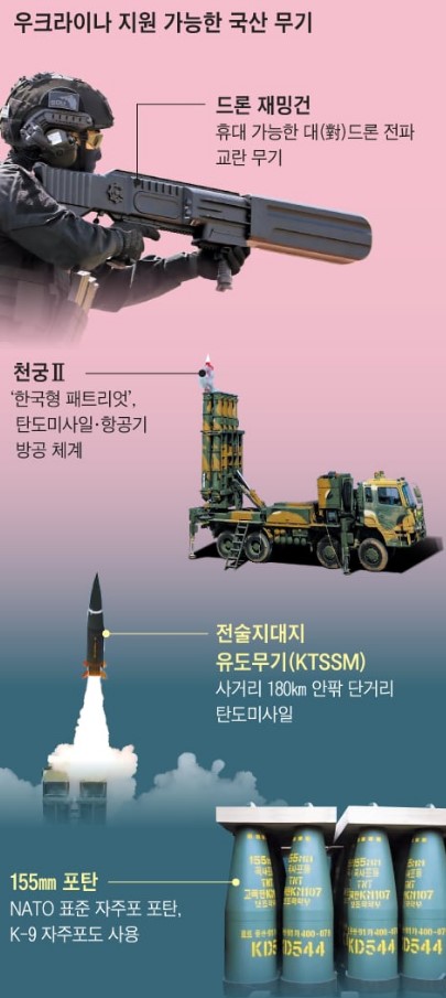 如果韩国政府决定提供杀伤性武器,还有望提供名品K军工的武器K-2战车、K-9自行火炮、天舞多管火箭、战术地面制导武器等。韩国军方消息人士说:“K-2战车和K-9自行火炮是已经对韩军供货完毕的武器系统,随时发出‘GO’的指令就能制造出来。”包括K-9在内,韩国可以批量生产乌克兰军队自行火炮使用的155毫米炮弹,预计短期内可以交货。韩国政府已经向美国提供了50万枚155毫米炮弹,在迂回支援乌克兰。