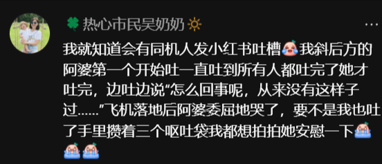还有乘客表示:“我斜后方的阿婆第一个开始吐一直吐到所有人都吐完了她才吐完,边吐边说“怎么回事呢,从来没有这样子过……”飞机落地后阿婆委屈地哭了”。
