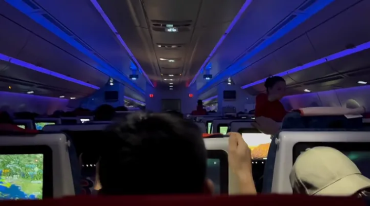 从网友发布的视频来看,前排乘客双手紧紧抓住座椅,空姐则是在过道中安抚乘客。