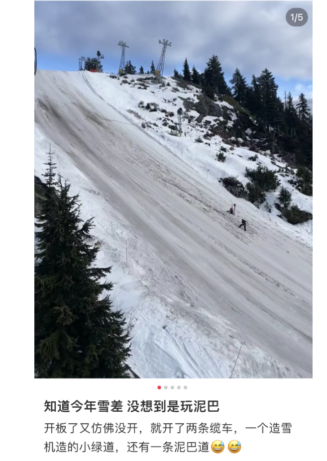 Cypress Mountain的滑雪場也拾分糟糕。有人吐槽說好不容易趕上休息日,斥“巨資”買了個雪票卻等來壹個在泥土上滑的滿身污泥。