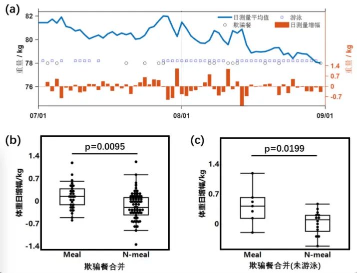 王春承論文中游泳減肥月的日均體重變化與欺騙餐及游泳數據。摘自受訪者文章