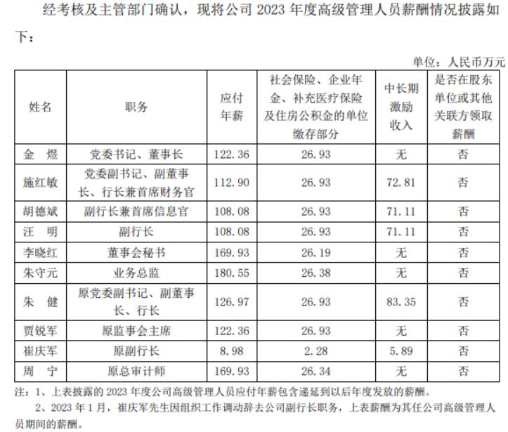上海银行董事长金煜、原行长朱健去年年薪分别为122.4万元、127万元;施红敏、胡德斌、汪明、崔庆军四名副行长(含原副行长)去年薪酬分别为112.9万元、108.1万元、108.1万元、9万元。其中,2023年12月,施红敏被聘为该行副董事长、行长,兼任首席财务官;2023年1月,崔庆军因组织工作调动辞任该行副行长,上述薪酬为其任该行高级管理人员期间的薪酬。