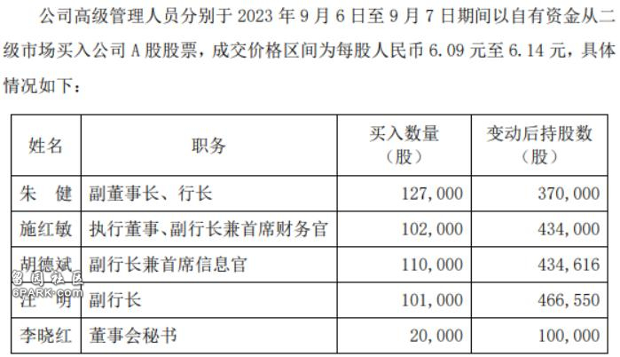 据公告,2023年9月6日至7日,朱健、施红敏、胡德斌、汪明以自有资金增持了该行A股股票,成交价格区间为每股6.09元至6.14元,增持后持股数分别为37万股、43.4万股、43.5万股、46.7万股。