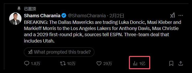 隨後,他將這筆宇宙級交易的推文置頂,到今日該推文的瀏覽量已突破1億次大關!