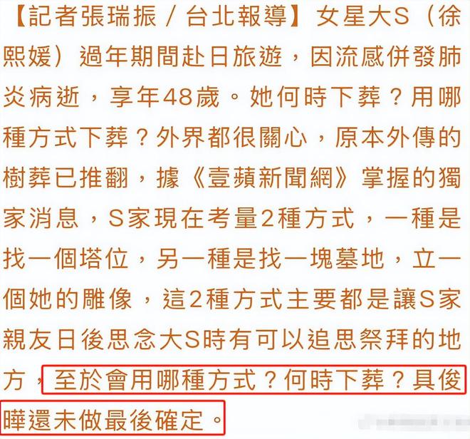 其他名人离世7天之内就可以入土为安,大S被耗了一个月,这才终于正式确定了下葬方式。