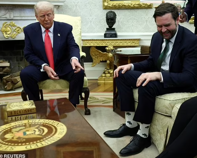 在一次会议中,川普还邀请副总统J.D. 万斯(JD Vance)发表看法,并笑着调侃他的幸运草袜子。