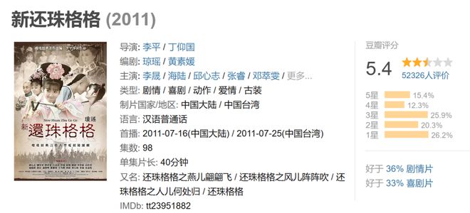 她的代表作《新还珠》当年毕竟被全网嘲“雷剧”,至今豆瓣评分仅有5.4。