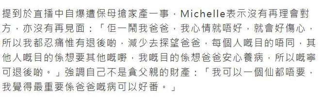她强调,自己不是贪图父亲的财产,“我可以一分钱都不要,我觉得最重要是爸爸的病可以好起来。财产怎么分配,是爸爸自己的事,他愿意怎么安排都可以,这一年来,我对他的看护治疗和求医问药都是无偿的。”