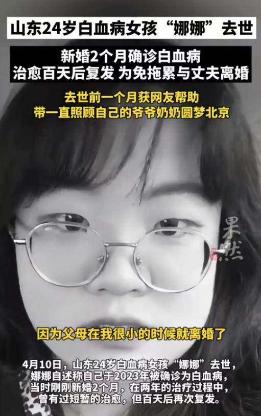 就在前几天,山东女孩娜娜也因白血病去世,年仅24岁,娜娜是结婚2个月确诊的白血病,为免拖累与丈夫离婚了,都还那么年轻,令人无比惋惜。