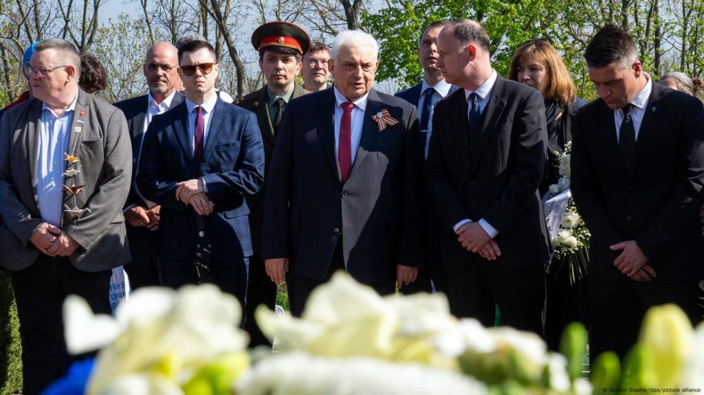 4月16日,俄羅斯大使涅恰耶夫(前排左叁)應邀出席塞洛烏高地戰役紀念活動,引發廣泛爭議圖像來源: Soeren Stache/dpa/picture alliance