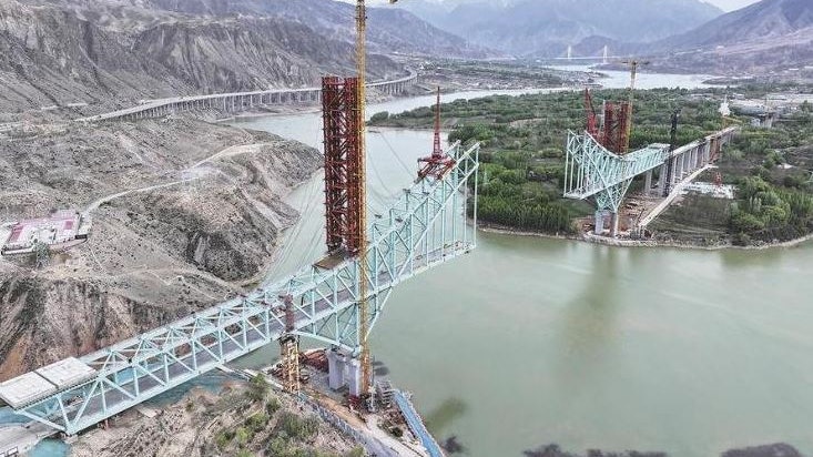 川青铁路尖扎黄河特大桥合龙前资料照片。 (人民日报)