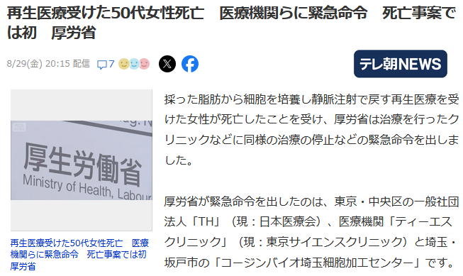 日本厚生勞動省收到報告後,認為患者死亡原因調查不充分,“考慮到過程,不能否定與再生醫療的關聯”。他們會進行深入調查,希望能夠查明該女性死亡的真相。