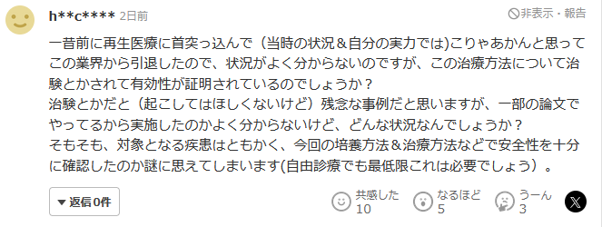 不管作為實施對象的疾病是什麼,這次的培養方法和治療方法,是否充分確認了安全性似乎還是個謎(即使是自由診療,這也是必要的)。