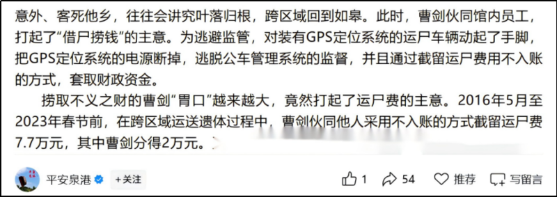 如皋市殡仪馆原馆长曹剑,伙同员工把运尸费偷偷截留不入账。
