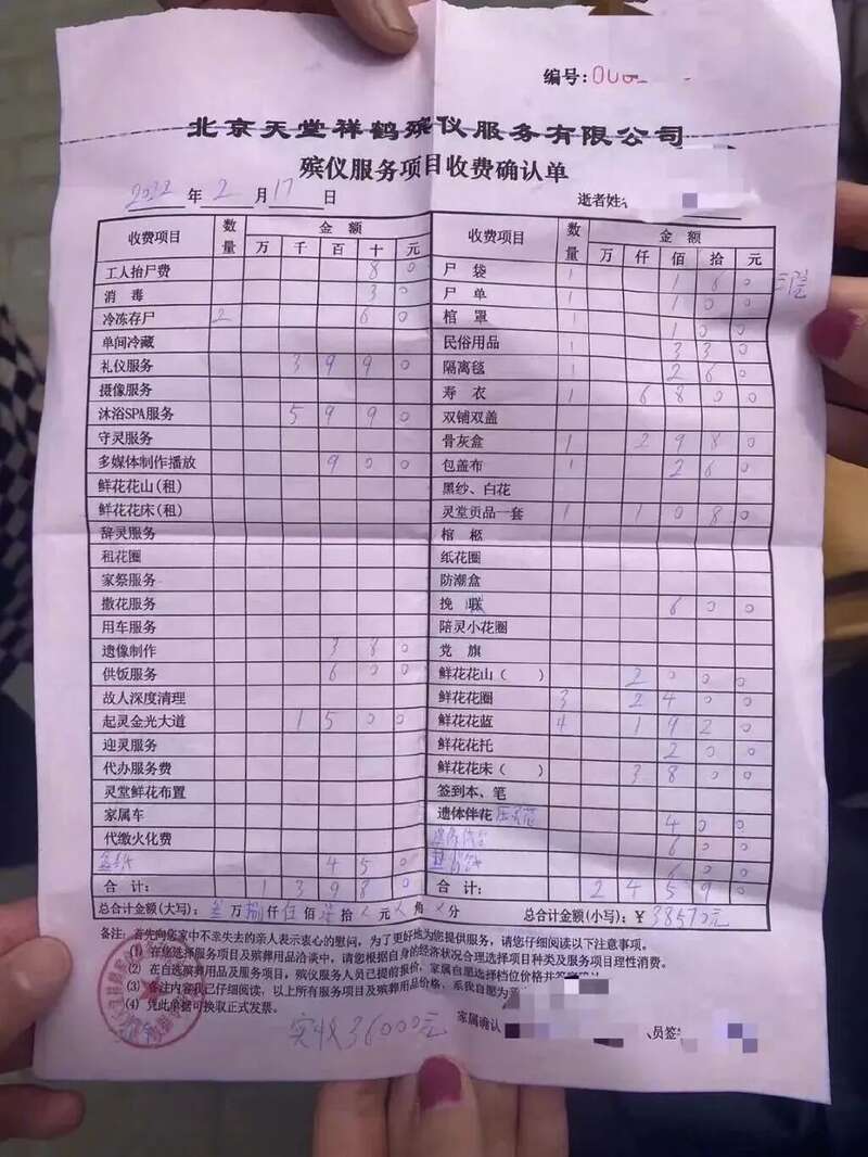 一家殡仪服务公司给出的三天遗体停放费,达到了3万8,家属一看,里面包括了600的吃饭费,5990的沐浴SPA服务。
