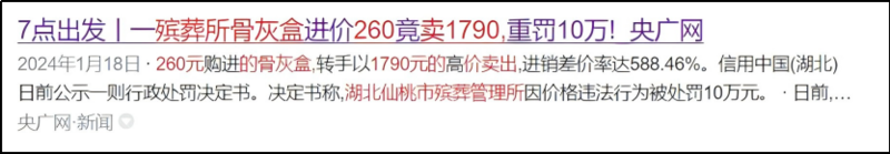 湖北仙桃市一个殡葬管理所把进货价260元的骨灰盒,卖到1790元,而且卖爆了,两年卖了1500多万元。