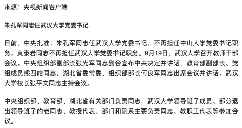 所以看得出来,朱孔军书记对高校意识形态的研究,应该是很深入的。而此时把这位对高校意识形态做过深入研究的领导调到武汉大学,具体是为什么?
