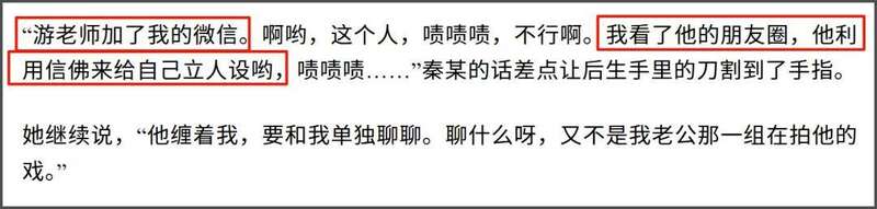 除了王家卫,秦雯还蛐蛐游本昌,游老师主动加了她的联系方式,结果秦雯说看了游本昌的朋友圈,“他利用信佛来立人设”,还不耐烦游本昌缠着她聊剧情,说不是她老公负责拍游本昌——啊?演员和编剧聊聊剧本有什么问题吗?