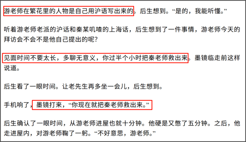 最后秦雯和游本昌确实聊了,但没聊很久,因为王家卫打电话叫人把秦雯“救出来”了。游本昌还很不舍,感谢秦雯把角色写得这么好,不过还好没聊很久,因为据古二说游本昌的角色是古二用沪语写的,和秦雯可能真没什么好聊的。