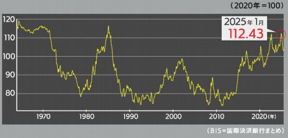 被视为反映货币综合实力的"实际有效汇率"(根据国际清算银行BIS数据)显示,以2020年为基准100时,今年1月特朗普政府上任之初该指数为112.43。
