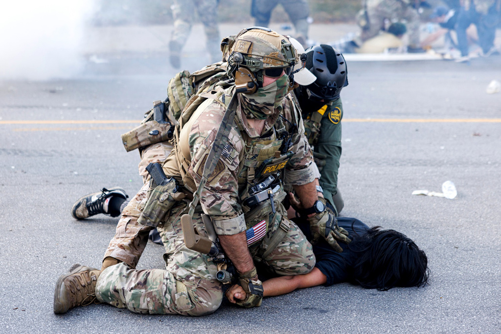 美国联邦政府加强对芝加哥执法,引发当地民众抗议。 画面为4日联邦官员压制一名抗议人士。 (美联社)