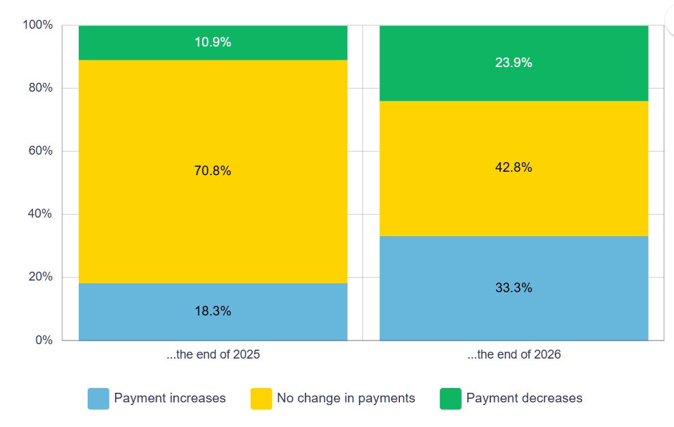 然而,借款人之间以及不同产品类型之间还有巨大差异。例如,持有五年期固定利率贷款合同的抵押贷款持有人在2025年或2026年续签时,平均还款额可能比2024年12月的还款额增加约15%-20%。持有浮动利率和浮动还款额的抵押贷款持有人,平均还款额可能会下降约5%-7%。