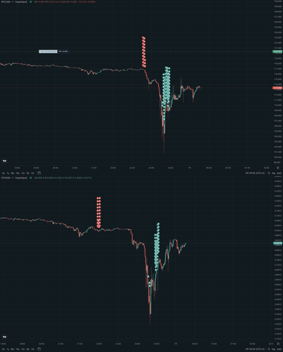 三十分钟后,特朗普的消息发布,加密货币市场崩盘。比特币从 12.25 万美元跌至 10.5 万美元,跌幅近十五个百分点。账户主人平仓离场,获利 1.92 亿美元。