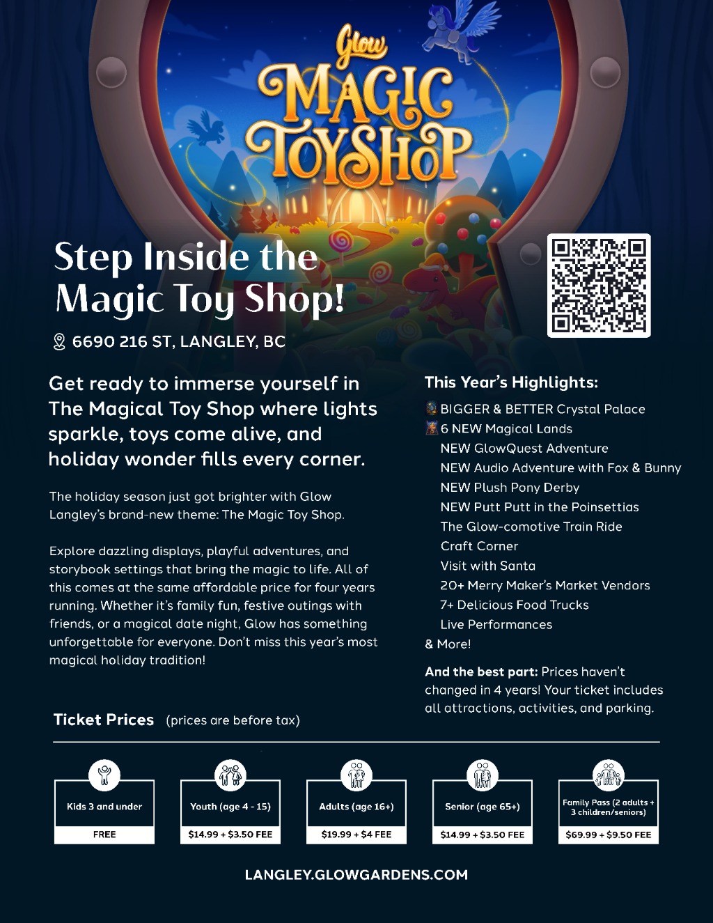 BC省最受欢迎的圣诞节体验定将让来宾兴奋不已,因为他们被吸入魔法玩具店的钥匙孔,那里的灯光耀眼,节日奇迹充满了每个角落。 Glow Langley 2025 将引入六个神奇的新土地、Fox 和 Bunny 的新音频冒险以及互动的 GlowQuest 体验回归,游客使用我们的新冰雪魔杖将本次主题灯展带来终生难忘的体验。