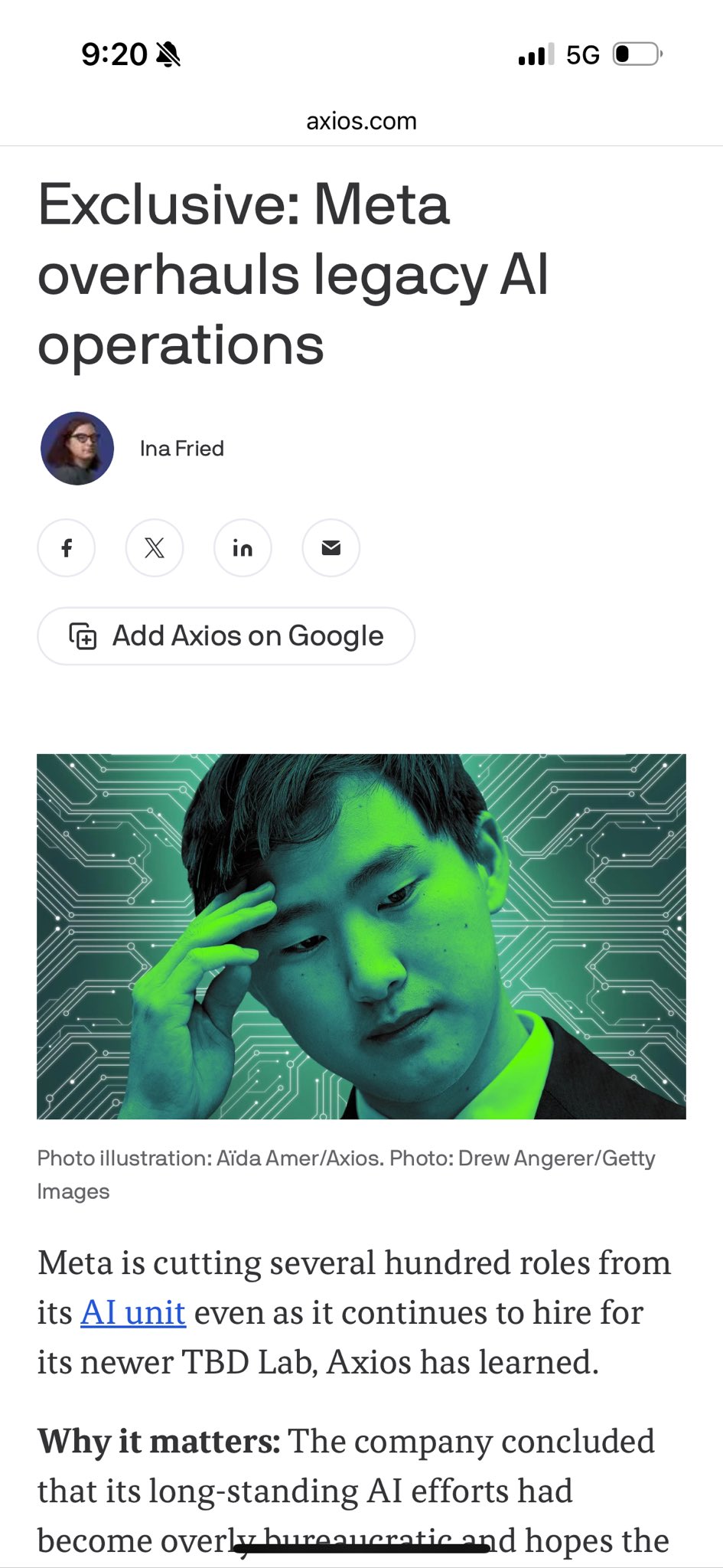 Axios:Meta重组AI业务 约600个职位被裁撤