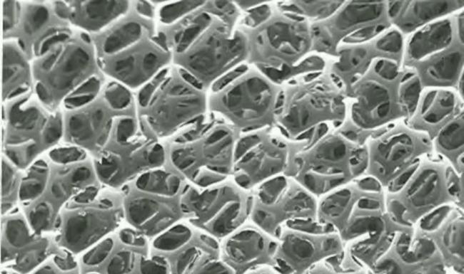 所以,大家就研究出了气凝胶这种东西。它本质上是一种多孔结构的纳米材料,外形像一个果冻,放大看却像一块海绵。