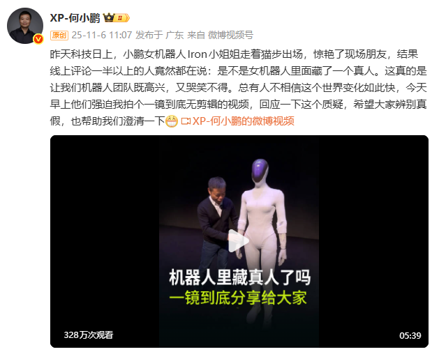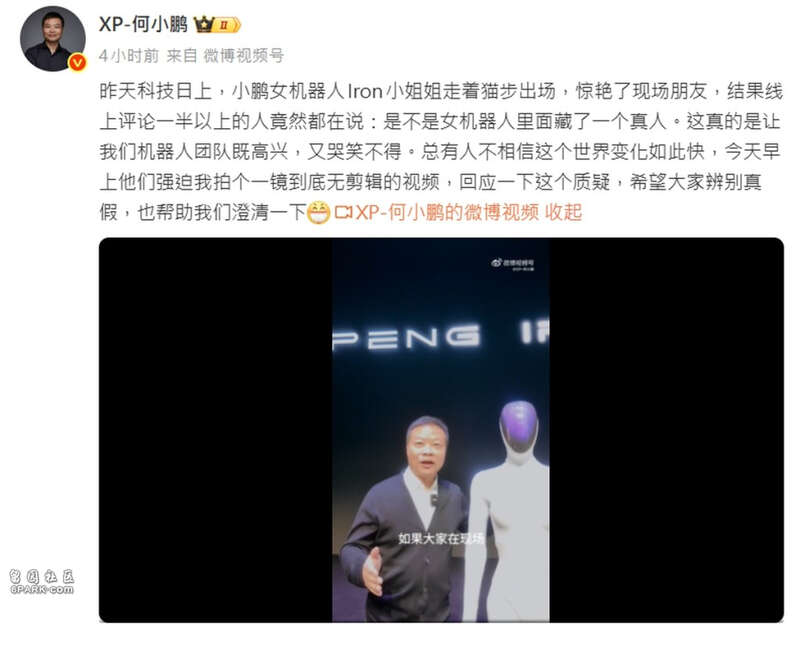 何小鹏6日上午微博回应:昨天科技日上,小鹏女机械人Iron小姐姐走着猫步出场,惊艳了现场朋友,结果线上评论一半以上的人竟然都在说:是不是女机械人里面藏了一个真人。这真的是让他们的机械人团队既高兴,又哭笑不得。