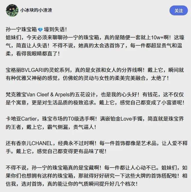 网友扒出她的“财富密码”, 约23万的卡地亚手镯、19.7万的卡地亚项链; 去马尔代夫坐私人飞机,工作室辟谣:“包机钱是六个品牌方分摊的”; 在杭州买下500平别墅,花园种满向日葵——“一举夺魁”的梗永不缺席。