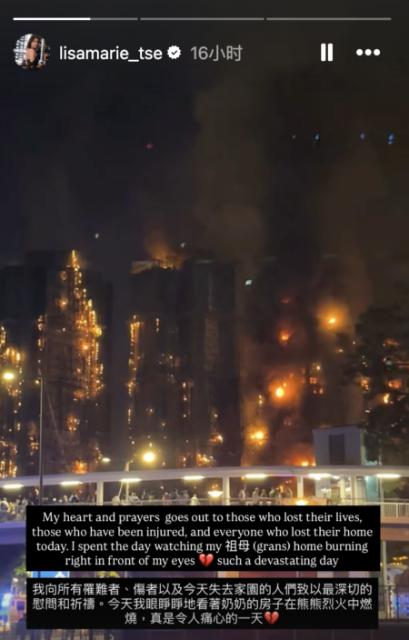 現年30歲的前港姐謝嘉怡在社交平台發出兩段視頻稱,26日下午在大埔宏福苑發生的火災,奶奶的房子也被燒毀。