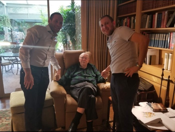 查理·芒格與他的房地產投資合伙人魯文·格雷頓(圖左)和阿維·邁耶在芒格位於洛杉磯的家中。圖片來源:Oscar Gomez