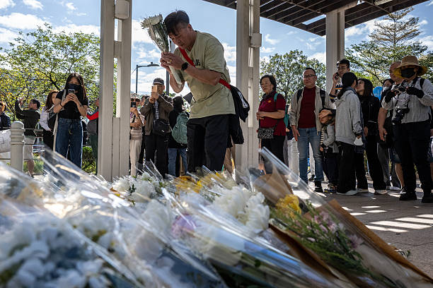 2025年11月29日,香港大埔區宏福苑發生重大火災,多棟公寓樓被燒毀,人們排隊悼念大火遇難者。(Tommy WANG / AFP via Getty Images)