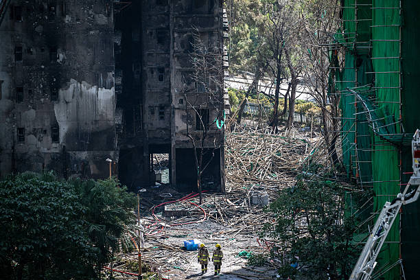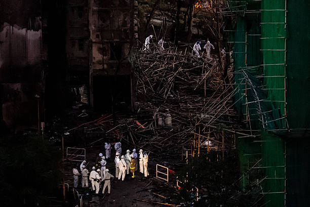 2025年11月28日晚,香港大埔區宏福苑發生致命火災後,身著白色全身防護服的警員進入火災現場巡查。 (Anthony Kwan/Getty Images)