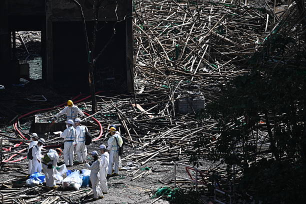 2025年11月29日,香港大埔區宏福苑發生致命火災後,身著白色全身防護服的警員在現場巡視。(Philip FONG / AFP via Getty Images)