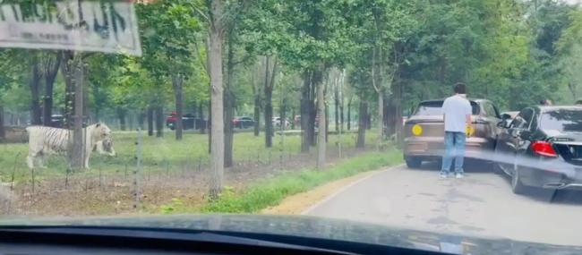 2025年9月,在秦皇島野生動物園,兩輛游覽車發生剮蹭,游客在猛獸區下車溝通,引來白虎靠近。(網絡截圖)