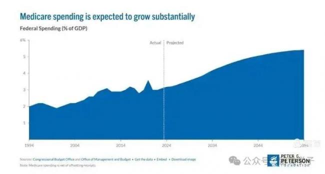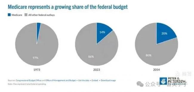 2023年联邦政府的Medicare 费用总支付 额为$839B,占该年度联邦总预算的14%,也是该年度美国国民生产总值(GDP) 的3%。 联邦医保费用总额以及占GDP份额逐年上升,预计在2054年将占总预算的20% (见下图), GDP的5.5%。Budget Basics: Medicare